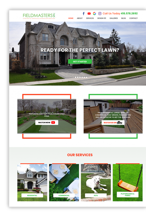 One of the most troubling oversights of Fieldmasters’ initial website was that the landing pages used for their digital marketing were hosted on URLs belonging to Rogers Outrank therefore, they were not contributing to the online success of the actual website belonging to Fieldmasters. So both earned and paid traffic were not being directed to the correct website, and not assisting with any growth for the company owned website. We knew that Fieldmasters was also not generating the number of leads they could have been, which meant that they were missing out on many potential sales opportunities. As the market became increasingly saturated with competing turf landscape design companies, Fieldmasters needed a robust and comprehensive strategy that could increase their website traffic and conversions/leads to significantly boost brand awareness and help them land the projects they deserve.